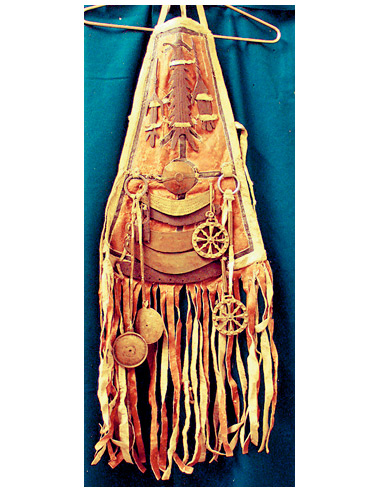 Во-первых, это вместилище духов-помощников, чьи изображения в виде подвесок мы видим на костюме.
