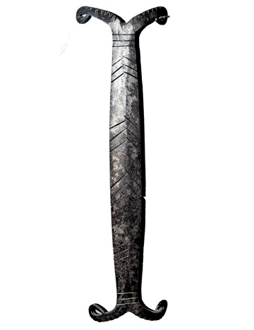 Кованая подвеска, крепившаяся сзади к шаманской обуви. Изображает кость голени. Туруханский край, начало XX века.