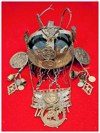 Отдельно рассмотрим шаманский головной убор — его называют обычно шапкой, наголовником или короной. В основе короны на рисунке ниже — медный обод, от него отходят две пересекающиеся вверху тонкие медные пластины, символизирующие швы черепа. С боков, над ушами, расположены две вогнутые пластины — это символические уши, с помощью которых шаман слышит язык духов и животных, птиц и растений. Они напоминают по форме звериные уши, что также подчеркивает смешанную, зооантропоморфную природу шамана и его функции посредника. Спереди на ободе припаяны два медных кружка — правый чуть закрывает большая круглая бляха. Это так называемые «тени глаз» — символические глаза шамана, которые он получил в ходе посвящения и которыми видит то, что невидимо для обычных людей. Железные оленьи рога наверху и разнообразные металлические подвески означают духов-помощников шамана, вместе с которыми он путешествует по вселенной. Некоторые из этих подвесок очень старые, есть скифские и даже античные, попавшие за полярный круг в древние времена. На других шапках встречаются и более новые украшения и знаки отличия, включая ордена и медали советского времени.