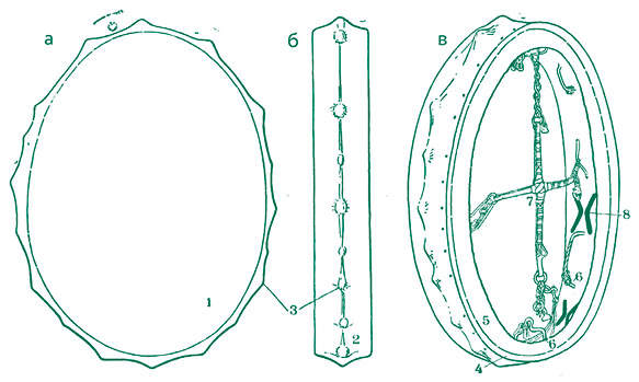Схема бубна: а — наружная сторона бубна; б — бубен сбоку; в — внутренняя сторона бубна: 1 — шкура, натянутая на обечайку, деревянный обруч круглой или овальной формы; 2 — обечайка; 3 — резонаторные «шишки»; 4 — место прикрепления шкуры к обечайке; 5 — свободная кромка шкуры; 6 — железные скобы с подвесками; 7 — крестовина (рукоять бубна); 8 — резонаторные щели в обечайке