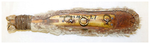 Колотушка к шаманскому бубну. Покрыта мехом с рогов оленя, накладка из рога с тремя медными кольцами. Таймыр, начало XX века.