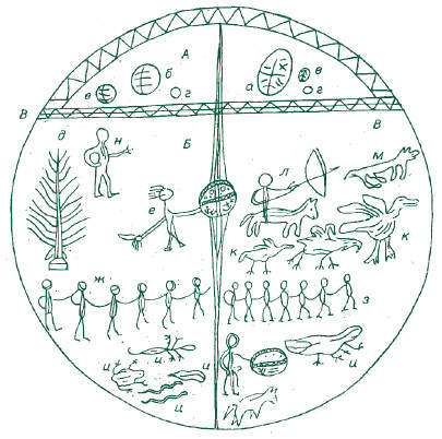 На бубне хакасской шаманки на рисунке выше мы видим три пространственные зоны: Верхний мир (А), Нижний мир (Б) и три слоя земли (В), которые отделяют небесный мир от подземного. По словам шаманки, в Верхнем мире расположены Солнце (а), Луна (б), Венера (в), звезды (г). В Нижнем мире обозначены: священная береза (д), дух-покровитель шамана (е), желтые девы, или «русалки» (ж), «черные люди» (з), духи (и), «вещие черные птицы» (к), сам шаман (л), волк (м) и горный дух (н).