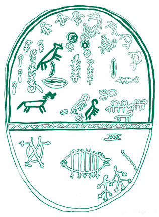 Кумандинский бубен на рисунке ниже разделен горизонтальной полосой на две неравные части. Верхняя часть означает небесную сферу, а нижняя — подземный мир. Их разделяют две параллельные линии, между которыми расположена зигзагообразная, вместе они символизируют Средний мир, а зигзаг — горы. В верхней части бубна изображены светила, деревья, птицы, кони, горные козлы, а также всадники — небесные божества. В нижней части бубна мы видим по краям подземных обитателей: лягушку, ящериц, змею, а в центре — фантастическое животное кер-бос, или кер-балык. Оно понималось как живущее под землей огромное чудовище — то ли зверь, то ли рыба — с открытой пастью, из которой торчат острые зубы.