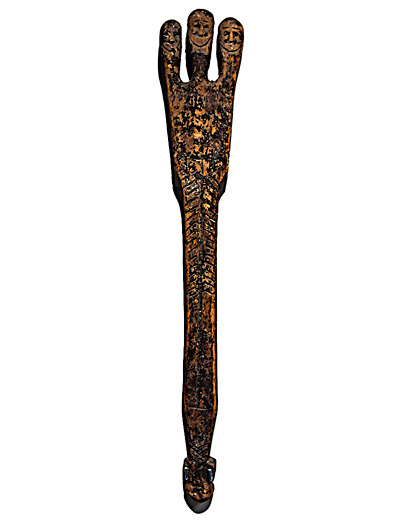 Нганасанский шаманский идол в виде дощечки, на одном конце которой вырезано три антропоморфных головы, на другом — одна.