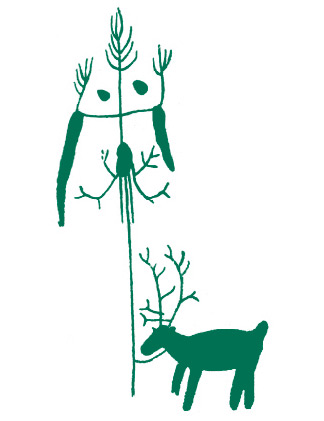Ритуальное дерево с привязанной жертвой — оленем. Рисунок селькупского шамана.