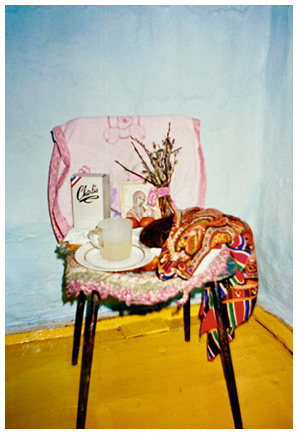 Для небольших ритуалов «кормления» духов-помощников особого пространства не требовалось — оно могло совершаться в жилище шамана или даже в музее, где хранились шаманские вещи, о чем мы говорили в . Но некоторая подготовка все же была нужна. Так, челканская шаманка Александра Казакоповна Абашева, собираясь пообщаться со своими духами, поставила в углу комнаты стул, где разместила в чашке угощение, флакон духов, свой шиньон и платок, а также икону Богородицы, два крашеных яйца и пучок вербы — ценные и сакральные вещи, имеющиеся в ее доме.