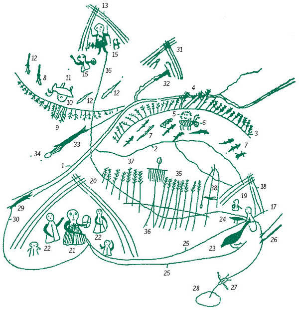 Эвенкийский рисунок, изображающий камлание шамана над больным: 1 — р. Подкаменная Тунгуска; 2 — ее притоки; 3 — земля рода Момоль; 4 — родовые священные деревья, место совершения обрядов; 5 — дух-хозяйка родовой земли; 6 — дух-покровитель рода Момоль; 7 — мифическая родовая ограда-засека из шаманских духов-сторожей; 8 — земля рода Нюрумналь; 9 — место родового культа членов рода Нюрумналь; 10 — дух-покровитель рода Нюрумналь; 11 — священные деревья рода Нюрумналь; 12 — мифическая ограда-засека рода Нюрумналь из шаманских духов-сторожей; 13 — чум шамана рода Нюрумналь; 14 — шаман рода Нюрумналь; 15 — его помощники; 16 — след шаманского духа — источника болезни, посланного шаманом рода Нюрумналь в род Момоль; 17 — дух болезни, пробравшись незаметно через ограду в род Момоль и превратившись в червяка-древоточца, проникает во внутренности одного из членов рода Момоль и начинает уничтожать его телесную душу; 18 — чум больного члена рода Момоль; 19 — его жена; 20 — чум шамана рода Момоль; 21 — шаман рода Момоль камлает, чтобы узнать о причине болезни сородича; 22 — сородичи, присутствующие на камлании; 23 и 24 — шаманские духи — гусь и кулик, которых шаман посылает к больному с поручением выгнать духа болезни; 25 — дорога шаманских духов; 26 — шаманские духи — расщеп и копье, которые должны поймать духа болезни, когда он выйдет из больного; 27 — шаманский дух-сова, несущий духа болезни к пропасти Нижнего мира; 28 — вход в Нижний мир; 29 — шаманский дух — двухголовая щука, посылаемая шаманом рода Момоль, чтобы отомстить роду Нюрумналь; 30 — след духа — двухголовой щуки; 31 — чум больного члена рода Нюрумналь; 32 — дух-щука вырывает телесную душу у больного; 33 — дух-щука уносит телесную душу больного; 34 — телесная душа больного человека; 35 — изгородь из духов-лиственниц, построенная шаманом рода Момоль в месте прохода чужеродного шаманского духа; 36 — шаманский дух-расщеп, поставленный шаманом рода Момоль над следом чужеродного духа; 37 — подвешенные к идолу шкурки зверей; 38 — шкура оленя, принесенного в жертву божествам Верхнего мира