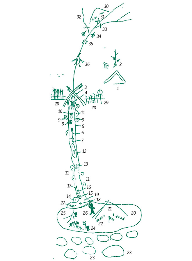 Эвенкийский рисунок, изображающий проводы шаманом умершего сородича в мир мертвых: 1 — покинутый чум умершего сородича; 2 — могильный помост; возле него на дереве висят вещи, сопровождающие умершего в мир мертвых; 3 — шаманский чум, сооруженный для обряда проводов умершего; 4 — шаман отвозит телесную душу умершего в Нижний мир; 5 — мифическая родовая река; 6 — шаманский дух-лиственница расчищает для шамана дорогу; 7 — шаманский дух-гагара показывает шаману дорогу; 8 — шаманский бубен, заменяющий шаману лодку; 9 — шаманские духи-охранители; 10 — телесная душа умершего следует за шаманом на своем могильном помосте-плоту; 11 — стойбище мифических родовых старух — хозяек дороги в Нижний мир, которых шаман расспрашивает о дороге в селение мертвых; 12 — шаманский остров на середине пути в Нижний мир, где шаман отдыхает у старухи — хозяйки родовой реки и советуется о дальнейшем пути; 13 — речной порог, где стоит ловушка, построенная шаманом из духов; 14 — конечное стойбище мифических родовых старух — хозяек дороги в Нижний мир; шаман, пристав к берегу, кричит через залив в селение мертвецов, чтобы они взяли привезенную телесную душу умершего сородича; 15 — шаманский бубен, служащий лодкой; 16 — телесная душа, привезенная шаманом; 17 — жертвенный олень; 18 — шаманский дух-гагара, плывущий впереди шамана как проводник; 19 — залив в устье мифической родовой реки, за которым начинается Нижний мир; 20 — место поселения мертвецов-сородичей; 21 — стойбище мертвецов-сородичей; 22 — женщины-мертвецы сидят возле костра и занимаются разными хозяйственными делами; 23 — девять шаманских земель: на восьми живут духи предков шамана, а на самой большой — хозяин Нижнего мира — манги; 24 — мужчины-мертвецы промышляют зверя; 25 — мертвые сородичи-мужчины строят на реке закол — ловушку для ловли рыбы; 26 — старуха — глава селения мертвецов поднимается на крутой яр и дает знак одному из мужчин переплыть через залив и привезти в селение телесную душу умершего члена рода; 27 — один из мертвецов едет в лодке через залив за приплывшим на могильном помосте-плоту сородичем; 28 — шаманские духи-помощники, прикрывающие вход в Нижний мир; 29 — шкура жертвенного оленя; 30 — омирук — родовое хранилище душ оми; 31 — души оми; 32 — притоки верховья мифической родовой реки; 33 — ловушки, построенные шаманом из духов-помощников, чтобы преградить доступ духам болезней в омирук; 34 — шаманские духи в образе птиц охраняют проходы в омирук с воздуха; 35 — шаманские духи в образе рыб охраняют проходы в верховья родовой реки; 36 — душа оми, превратившись в птицу, улетает от манги в омирук
