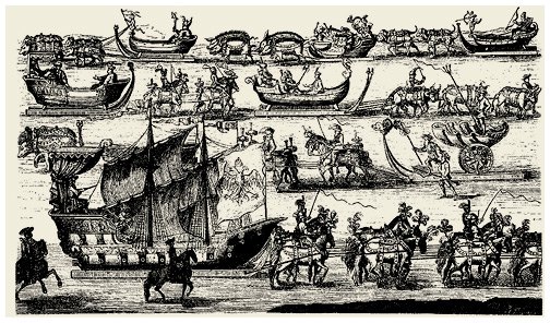 В 1722 году Петр I устроил на Масленицу подобие европейского карнавала. На четвертый день Масленицы из Всехсвятского села (сейчас это территория районов Аэропорт и Сокол) к Кремлю отправилась целая процессия — «потешный поезд», который состоял из макетов кораблей, закрепленных на полозьях. В эти своеобразные сани запрягли лошадей, волов, баранов, собак и даже свиней. Возглавлял процессию «штукарь», управляющий шутами. Он ехал на больших санях, запряженных шестью лошадьми. За ним следовал остальной «флот»: морская колесница Нептуна; большая лодка князя Ромодановского, которую везли два настоящих медведя; восемнадцатипушечный корабль с тремя мачтами, который тащили шестнадцать лошадей. На корабле ехал сам Петр в капитанском мундире, окруженный офицерами и генералами.