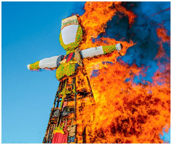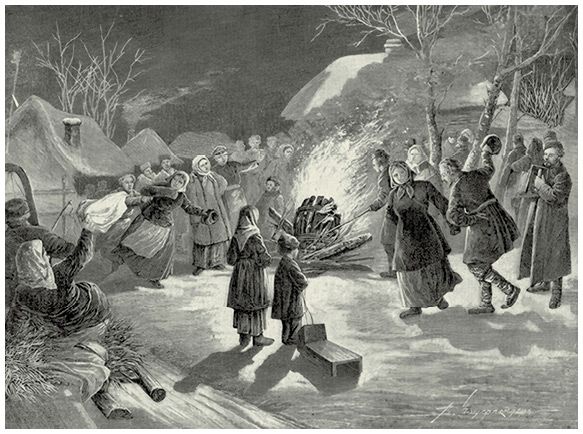 В финале масленичного разгула уничтожали не только чучело: разламывали или сжигали горки, разрушали снежных баб, разбивали приспособления, на которых катались, расправлялись с едой — чтобы ничего не напоминало о разгуле.