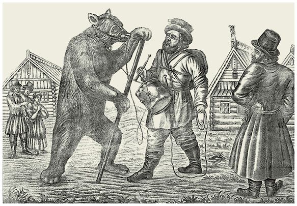 Медведь — плясун всех зрителей потешает… Литография П. А. Глушкова, 1870 г.