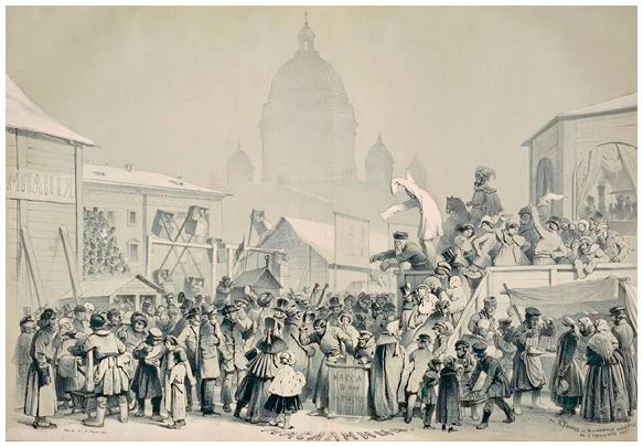 Каждый народ имеет свои отечественные любимые забавы, показывающие некоторым образом его нрав и душевные наклонности. Масленица во всей Европе есть время торжества забав сиих: тогда видим мы у испанцев сражения с буйволами, у англичан — кулачные бои, лошадиные скачки, у французов — пляски, у итальянцев — маскарады и проч., а для русских главнейшее удовольствие составляют ледяные горы. Горы сии строятся по сие время не только во всяком городе, но и во всяком почти селении. В Петербурге строят их обыкновенно на Охте, на Крестовском острове и на Неве перед императорским дворцом. Вокруг Невских гор строятся тогда сараи, в коих показывают разных животных, привозимых из чужих краев, кукольные комедии, китайские тени, пляски на канате и прочее.