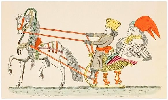 Катались обычно на двойках и тройках, а кто был побогаче, запрягал даже 6–7 лошадей. Каждый старался украсить повозку: лошадям заплетали гривы, на дугу вешали ленты, цветные лоскуты, колокольчики, бубенчики, крепили цветы из бумаги. На лошадей накидывали ковры, цветные покрывала (получалось что-то вроде попоны). Участники катания садились в дровни или розвальни — сани без сиденья, в обычное время предназначенные для перевозки дров, сена, грузов. При возможности запрягали лошадь в кошевки / крёсла: пассажирские сани, у которых есть борты и сиденье. Их, конечно, тоже украшали: все теми же лентами, цветной тканью, сиденья и спинки застилали коврами, полушубками — и красиво, и тепло. В Вязниковском уезде Владимирской губернии к передку санок крепили красные флаги на шестах.