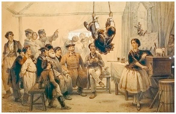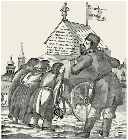 Балаган странствующего комедианта. Литография Василия Тимма, 1851 г.
