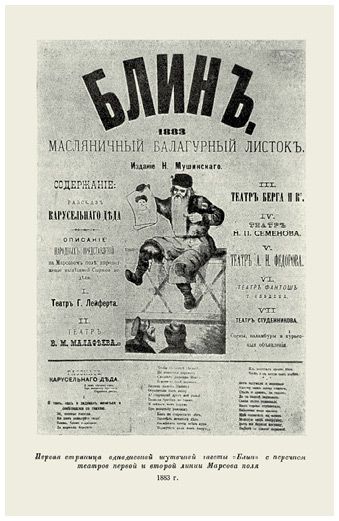 Первая страница однодневной шуточной газеты «Блин» с перечнем театров первой и второй линий Марсова поля, 1883 г.