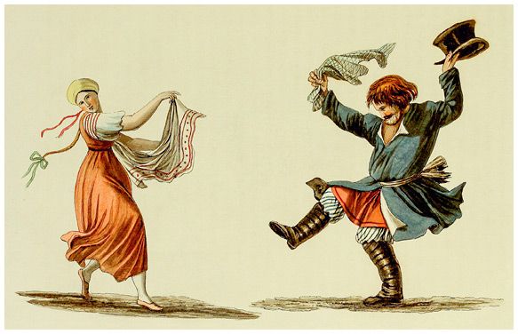 Пляска русских крестьян. Иллюстрация из книги «Характер русских и подробная история Москвы» Роберта Лайалла, 1823 г.
