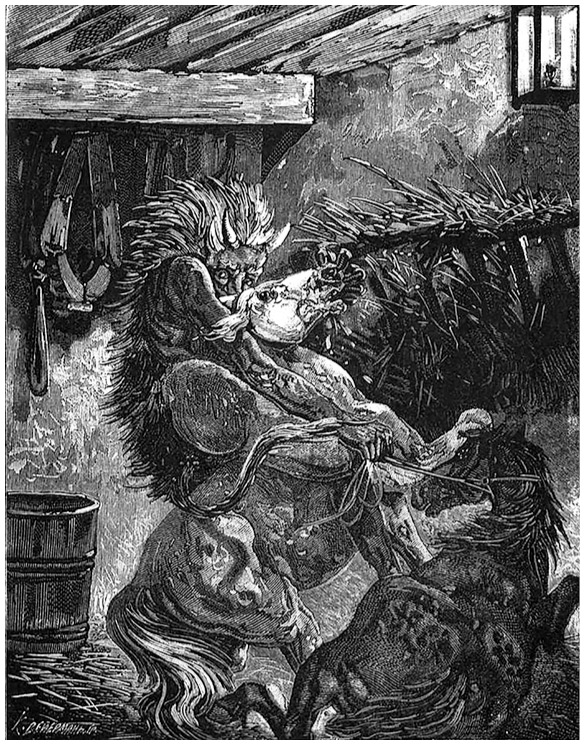 Одна старая девица рассказывала мне, как она однажды видела дворовушка. «Однажды я, — говорит, — ночевала у своего дяди, у него есть две дочери. Все мы легли спать. И вот пробудилась я ночью и вижу, что какой-то мохнатый человек с синим огнем в руках заплетает волосы у одной из дядиных дочерей. Заплетя у первой, он заплел и другой, потом и ушел». Я, смеясь, сказал ей: «А что он у тебя, у гостьи, не заплел?», она ответила: «Потому, что я не из его дому, у нас есть свой дворовушко».