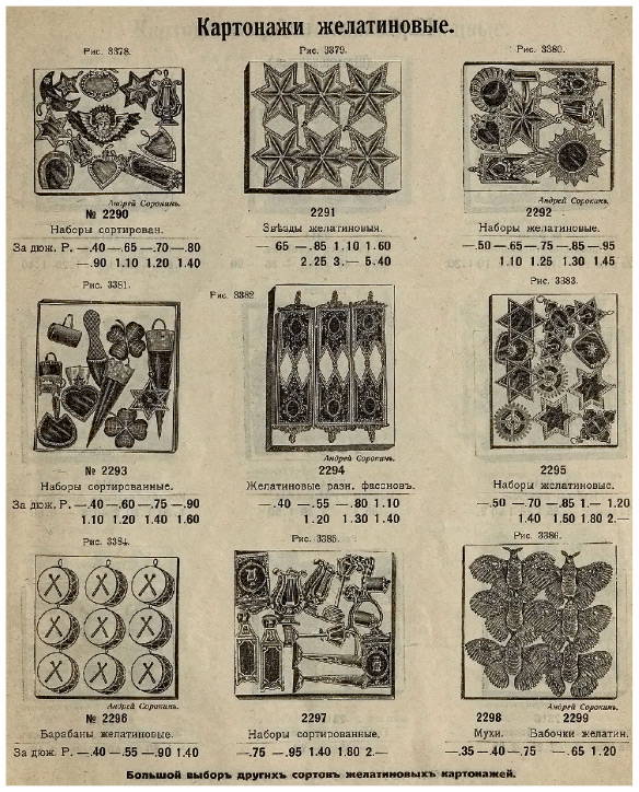 Страница из рекламного каталога с демонстрацией желатиновых украшений. 1913 г.