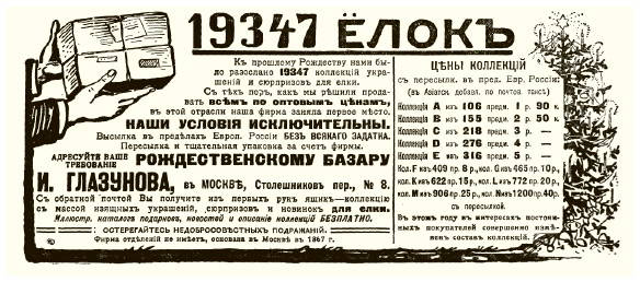 Московский Рождественский базар И. Глазунова отправлял украшения и подарки по почте в другие города. Объявления в газетах обещали «качество и дешевизну» изделий. Как и в каталогах «Мюра и Мерилиза», предлагались готовые наборы: «коллекции» для домашних елок стоили от 3 руб. 50 коп. до 42 руб., «специальные коллекции для елок в собраниях, клубах и т. п.» — от 25 до 100 руб.