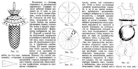 Кисточками мы обмазывали грецкий орех, потом клали его на золотую бумажку и осторожно, едва касаясь ее пальцами, прилепляли бумажку к ореху. Готовые орехи клались на блюдо, и потом, когда они высыхали, к ним булавкой прикалывалась розовая ленточка в виде петли так, чтобы за эту петлю вешать орех на елку. Это была самая трудная работа: надо было найти в орехе то место, в которое свободно входила бы булавка, и надо было ее всю всунуть в орех. Часто булавка гнулась, не войдя в орех до головки, часто кололись пальцы, иногда плохо захватывалась ленточка и, не выдерживая тяжести ореха, выщипывалась и обрывалась. Кончивши орехи, мы принимались за картонажи. Заранее была куплена бумага, пестрая, золотая и серебряная. Были и каемки золотые, и звездочки для украшения склеенных нами коробочек. Каждый из нас старался придумать что-нибудь новое, интересное и красивое. Клеились корзиночки, кружечки, кастрюлечки, бочонки, коробочки с крышками и без них, украшенные картиночками, звездочками и разными фигурами (Т. Л. Сухотина-Толстая. «Детство Тани Толстой в Ясной поляне»).