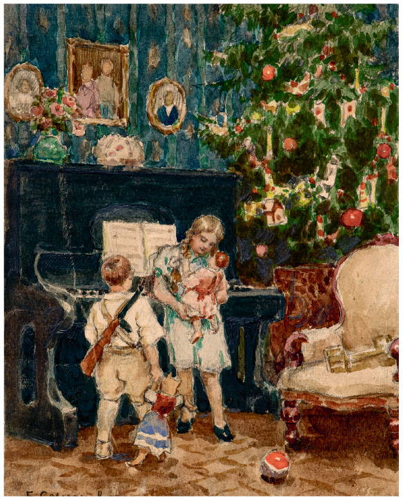 Я уселась с детьми на лестнице, и вот, наконец, двери растворились, и перед нами во всей красе предстала зажженная елка. Ах, как я люблю этот момент! Какой праздничный вид имеет вся комната с зажженной елкой и со столиками, на которых разложены подарки. Дети сначала как будто бы стеснялись, но потом разошлись и были в страшном восторге.
