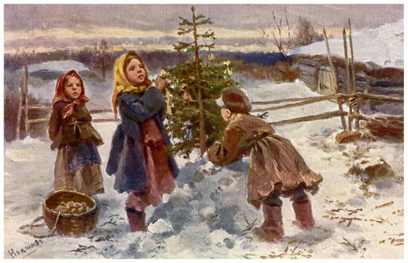 Крестьянские дети украшают рождественскую елку. Открытка начала XX в.