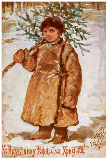 Крестьянский мальчик, несущий елку. Открытка с иллюстрацией Елизаветы Бём, 1899 г.