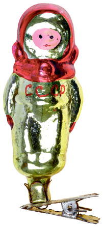 Одним из самых радостных событий 1960-х годов для жителей СССР стал полет Гагарина, и покорение космоса вскоре превратилось в новый популярный сюжет для елочных игрушек. Именно в это время начали делать макушки-шпили, изображающие ракеты, а не только звезды. Вместе с ними выпускали космонавтов, спутники, планеты. Надо сказать, что шпилями украшали елки еще до революции — их привозили из Европы. Такие модели есть в каталоге оптового склада Андрея Сорокина 1913 года. Наборы шаров украшали изображениями звезд, планет и называли «Галактика» или «Космос». Были шары с фосфором: нарисованные на них ракеты светились в темноте. Дополняли картину тематические флажки и электрические гирлянды.