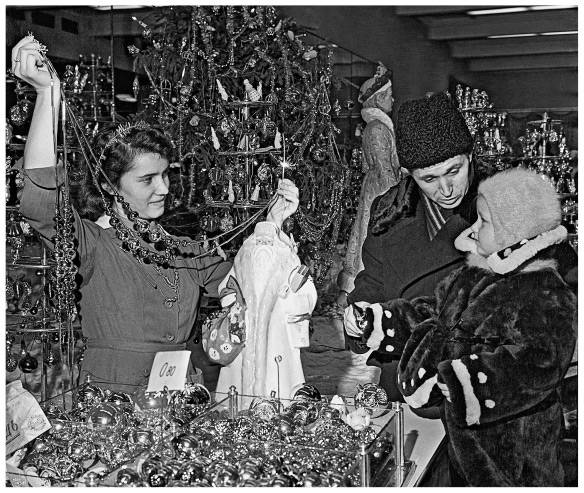 Много внимания уделяли праздничному оформлению магазинов. В 1957 году посетителей московского «Детского мира» у входа встречал огромный Дед мороз, а на лоджиях на фасаде, выходившем на Лубянскую площадь, стояли наряженные елки. В центральном зале установили десятиметровую елку, вокруг которой вращалась карусель. Там же смонтировали большое панно с двумя космическими спутниками Земли. На втором этаже центрального зала украсили шесть елок, в демонстрационном зале на четвертом этаже большие куклы водили хороводы вокруг трех елочек, и продавщицы в костюмах снегурочек предлагали покупателям новогодние украшения. В торговых залах «Детского мира» можно было найти готовые новогодние подарки, в которых лежали куклы в художественно оформленных коробках, наборы для юных техников, наборы для рукоделия, заводные игрушки для малышей.