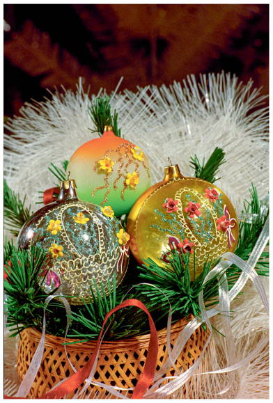 Несмотря на моду (в ассортименте нашей фабрики имеются модные елочные игрушки), от действительности не уйдешь: российский покупатель отдает предпочтение традиционному разноцветью. За границей жалуют нерасписные шары, а у нас предпочитают покупать такие, на которых есть роспись — сказочные сюжеты, новогодние орнаменты, звездочки, снежинки (Е. Альянова. «Новый год длиной в двенадцать месяцев», «Вечерняя Москва», 1997).