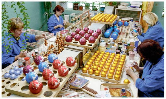 На фабрике «Елочка» продолжают выдувать игрушки по старым формам из детства, игрушки с серпом и молотом, бусы, в каталог вернулись монтажные игрушки.