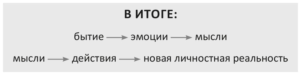 Наши мысли создают нашу жизнь: как только мы начинаем это понимать, мы получаем возможность установить дистанцию относительно внешних раздражающих факторов. Нас меньше тревожат СМИ, различные призывы и слухи, мы бережем свою свободу в отношениях, поскольку становимся более внимательны к собственному состоянию и отказываемся от негатива. Мы начинаем уделять внимание нашим эмоциональным связям, ведь на них влияет рутина и навязанные психологические стандарты, например «все мужчины всегда так реагируют», «все сотрудники подумают, что…» и т. п.