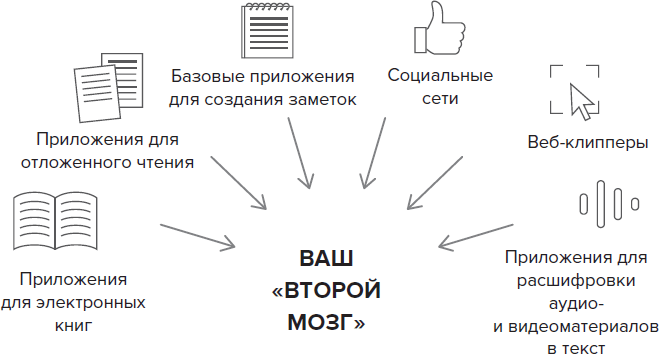 Пока выберите в каждом из списков выше по два-три вида контента, которые у вас преобладают и уже имеют ценность. Некоторые отдают предпочтение внутренним источникам знаний, некоторые – исключительно внешним, но большинство людей находятся где-то посередине. Со временем вы можете научиться сохранять информацию из десятков разных источников, но пока важно начать с малого и потихоньку привыкнуть, прежде чем нырнуть в этот процесс с головой.