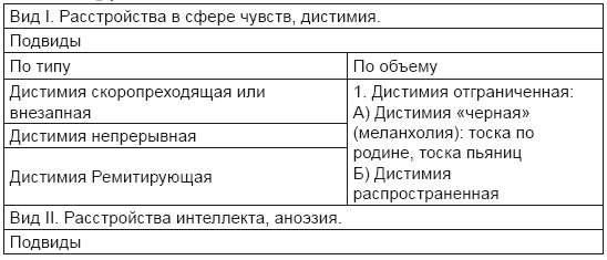 1. Болезни чувства — дистимия (гипертимия, атимия, паратимия).