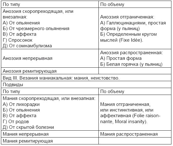 Одного взгляда на эту таблицу достаточно, чтобы отметить отвлеченно психологический характер подразделения Флемминга, напоминающий схоластические построения. Такие же свойства представляет группировка Кизера, изложенная в его знаменитой в то время книге «Элементы психиатрии» (1855). Приводим ее: