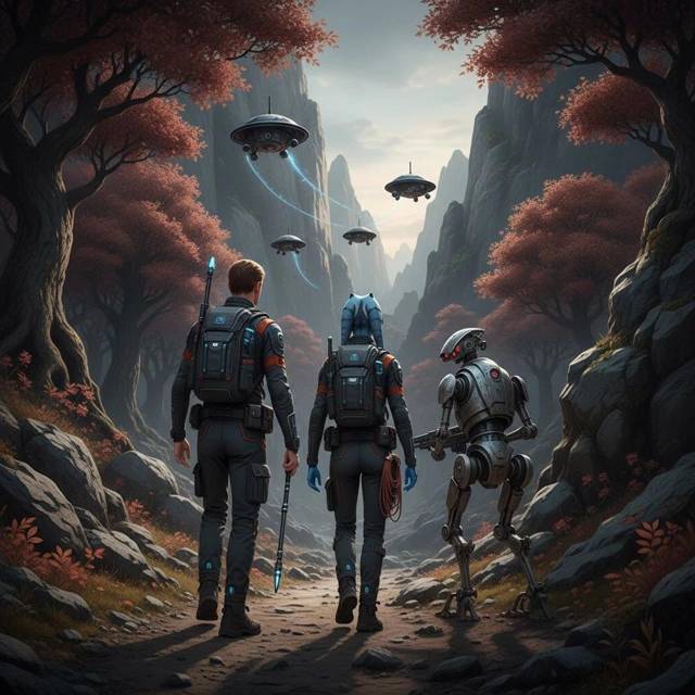 Утром четвертого дня они отправились в путь. Путь к горам занял целый день осторожного передвижения. Они избегали троп и мест возможных встреч с местными жителями, пробираясь через густые леса и каменистые склоны. Системы маскировки делали их практически невидимыми, но они предпочитали не рисковать. Для безопасности их сопровождал один IG-88, любимая модель Алекса.