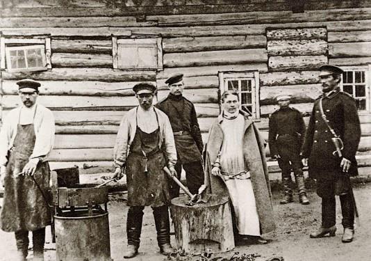 Рис. 14б. Сонька Золотая Ручка на каторге, заковывание её в кандалы. Постановочное фото 1897 г..