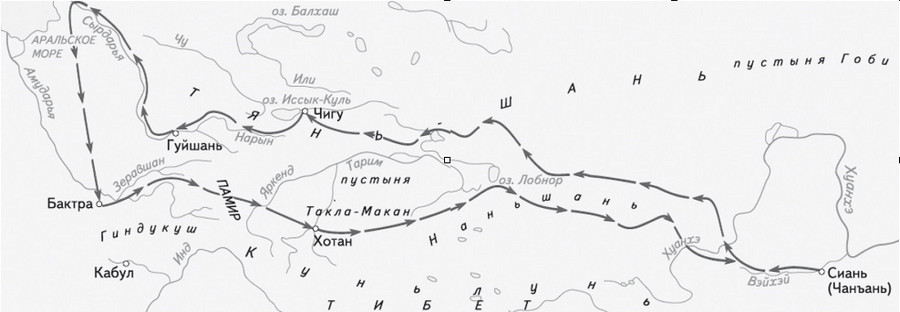 Карта с маршрутом путешествия китайского дипломата Чжан-Цяня