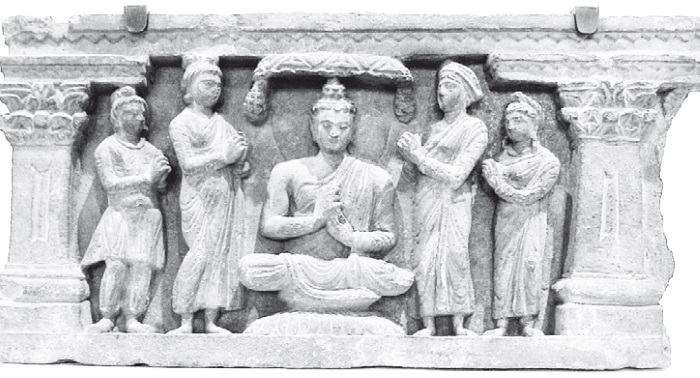 Барельеф с изображением молящихся вокруг божеств Будды, Брахмы и Индиры. II век н. э. Музей Гиме, Париж