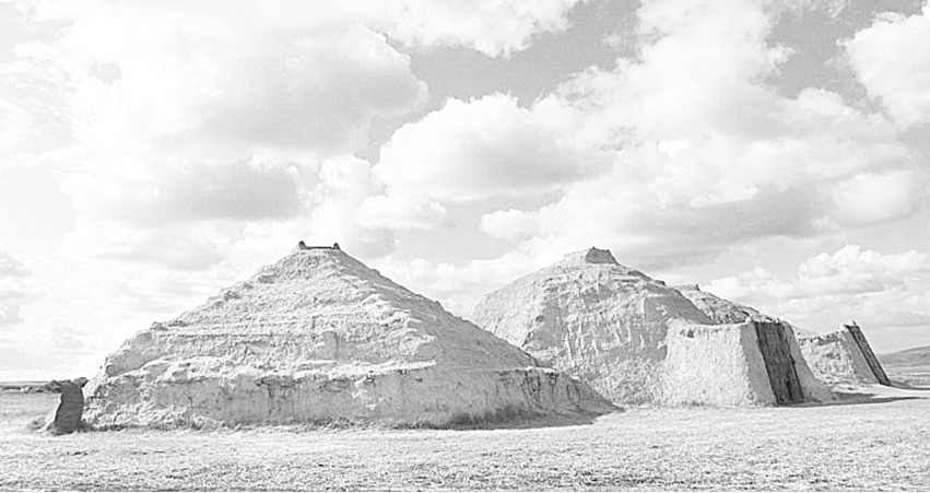 Реконструкция жилищ меднокаменного века в древнем поселении Аркаим. Жилища имеют грунтовые стены и бревенчатодерновый купол, в центре которого находится дымовое отверстие