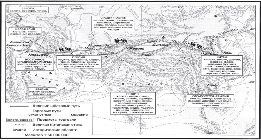 Одна из главных дорог, пересекающая Азию с востока на запад, начиналась в столице древнего Китая Чаньане и следовала до его северо-западных границ вдоль пустыни Гоби, через Таримский бассейн, далее по Восточному Туркестану. Переправившись через Тянь-Шань, часть караванов шла через Ферганскую долину и Ташкентский оазис в Самарканд – столицу Согдианы, Бухару, Хорезм, далее к берегам Каспия. Часть караванов из Самарканда держала путь в Бактрию и через долину Кашкадарьи выходила к Термезу, откуда, переправившись через Амударью, направлялась на Юг в Бактры и Индию.