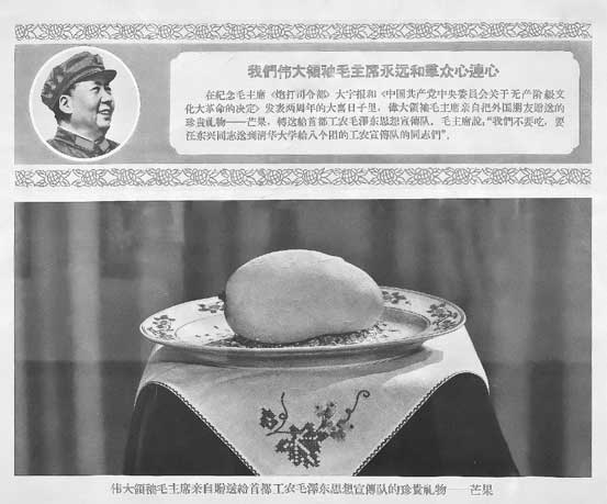 История с плодами манго, которые в Китае тогда были диковинкой, стала одним из наиболее ярких примеров всеобщего помешательства как проявления культа личности Мао Цзэдуна. Мао подарил рабочим манго, желая отблагодарить их за старания по наведению порядка в Цинхуа, а также для того, чтобы подчеркнуть ведущую роль рабочего класса (времена изменились, и теперь ключевым стал лозунг «Рабочий класс должен руководить всем»). Но разве могли члены команды просто съесть дар Председателя Мао, олицетворяющий его уважение к рабочему классу, новой движущей силе культурной революции? Конечно же нет! Плоды манго следовало сохранить и поклоняться им, как святыне. Ради обеспечения сохранности плоды помещали в формалин или обмазывали тонким слоем воска, но эти меры не могли предотвратить порчи – под воском плоды гнили, а в формалине съеживались и меняли цвет… А ведь дар Председателя Мао хотелось увидеть рабочим всей страны. Выход нашелся быстро – на фабриках начали массово изготавливать искусственные плоды манго из пластика, резины, воска и даже картона. Эти муляжи рассылались по стране и помещались на специальные алтари, рядом с портретом Мао. Крестьяне приходили в города издалека только ради того, чтобы увидеть дар председателя Мао… Поэты и писатели воспевали манго в своих произведениях: «Глядя на золотое манго, вижу Великого кормчего Мао Цзэдуна! Снова и снова прикасаюсь к манго, ощущая идущее от него тепло».