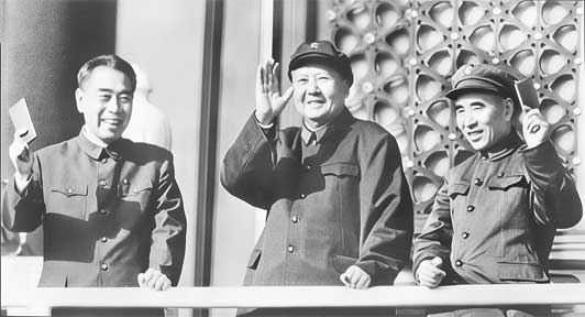 Чжоу Эньлай, Мао Цзэдун и Линь Бяо с «красными книжечками» на площади Тяньаньмэнь. 1967