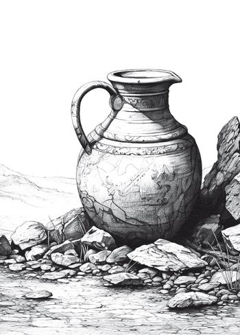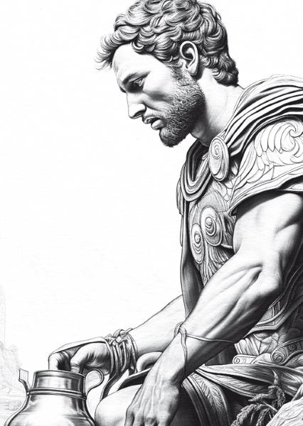 Этот сосуд принесли на Голгофу римские солдаты. В нем – posca, кислое вино низкого качества, смешанное с водой, уксусом и взбитыми яйцами. Этим напитком жнецы и солдаты обычно освежались в жару. Один из солдат срывает стебель иссопа, прикрепляет к его концу губку, окунает ее в кувшин, а затем подает Иисусу.