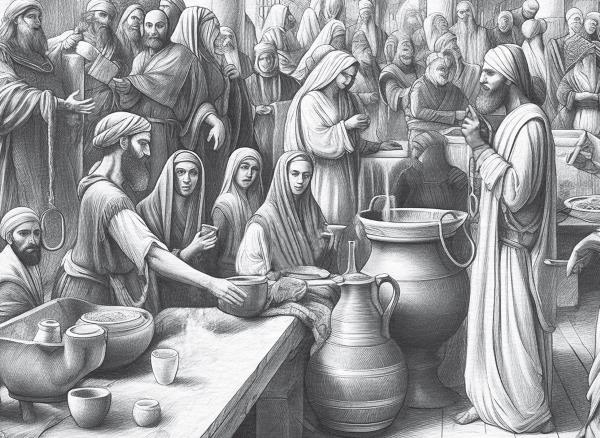 Свадьба в Кане, в понимании Иоанна, – это «знак», а не символ. Знак подразумевает нечто понятное и реальное, что необходимо осознавать с точки зрения высшей, духовной истины. Иоанн опирается на достоверные детали, которые, вместо того чтобы быть объединенными в целостное повествование, изолированы и толкуются в более возвышенном смысле. Отсюда и полный намеков характер повествования. Мы никогда не узнаем ни имен жениха или невесты, ни родственных связей с Иисусом и Его семьей. Ни того, почему это Мария первой заметила, что вина не хватает. Евангелист умалчивает даже о главных персонажах – невеста не появляется вообще, а жених едва упоминается.