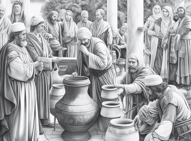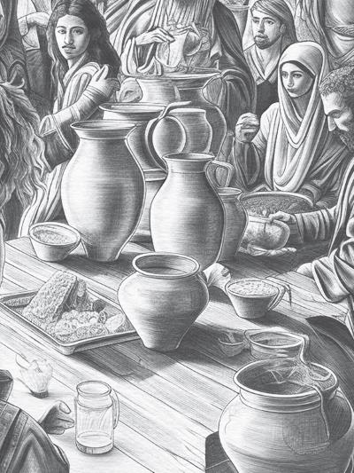 Евангелист подробно говорит о сосудах, упоминающихся в рассказе: «Было же тут шесть каменных водоносов, стоявших по обычаю очищения Иудейского, вмещавших по две или по три меры» (Ин. 2:6), то есть от 360 до 540 л. Это конкретные и по-своему важные детали: сосудов шесть, а не семь, то есть не идеальное число, и сделаны они из камня – все это символизирует несовершенства древнего Израиля и писаний Закона. По мнению Иоанна, Иисус намеренно использовал именно эти каменные водоносы, а не глиняные кувшины, имевшиеся в Его распоряжении. Превращение воды в вино становится символом преемственности между старым и новым Израилем. Так что, как мы видим, история и богословие у Иоанна тесно связаны между собой.