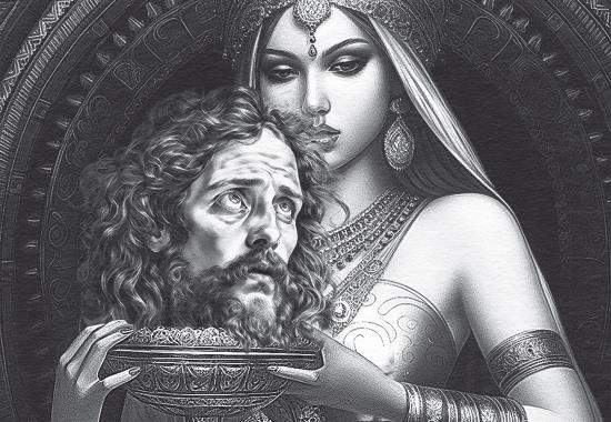 Среди танцовщиц была и очаровательная отроковица Саломея, дочь Иродиады и Ирода Филиппа. Антипа разгорячен зрелищем и дает клятву предоставить ей все, что она пожелает. Саломея отправляется за советом к матери, которая питает к Иоанну неугасимую ненависть с тех пор, как тот публично выступил против ее повторного брака. И потому она советует дочери попросить в качестве подарка голову Крестителя. Ирод Антипа вынужден подчиниться. Девушка получает кровавый дар и приносит его матери на блюде.