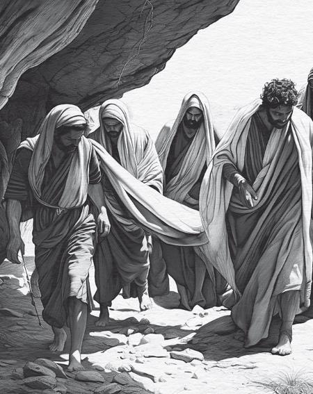 Иисус просит отвалить камень. Марфа восклицает: «Господи! уже смердит; ибо четыре дня, как он во гробе» (Ин. 11:39). «Иисус говорит ей: не сказал ли Я тебе, что, если будешь веровать, увидишь славу Божию?» (Ин. 11:40). Камень убирают. Лазарь похоронен по традиционным погребальным обрядам. Его тело тщательно омыли, сбрили бороду и волосы, подстригли ногти. Лазаря облачили в роскошную белую тунику, которую он надевал для торжественных церемоний. Руки и ноги связаны лентами, челюсть подвязана, но тело не завернуто в саван. После краткого воззвания к небесам Иисус восклицает: «Лазарь! иди вон» (Ин. 11:43). В узком проеме появляется некое подобие мумии: руки и ноги по-прежнему связаны, лицо прикрыто погребальным покрывалом. «Развяжите его, пусть идет» (Ин. 11:44), – приказывает Иисус.