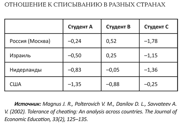 Студент А списал у студента В с его согласия. Студент С сообщил об этом преподавателю. А дальше я расскажу результат. Когда респондентов стали спрашивать, как вы относитесь к действиям всех трех участников, то все осудили списавшего, но в разной степени. В России не очень сильно, а американцы – сильно. Все осудили доносчика, но в разной степени. Американцы слегка, потому что он же хотел соблюдения правил, а наши – чрезвычайно сильно, потому что русская культура отторгает донос. Раскол произошел по поводу того человека, который дал списать. Потому что мы и израильтяне полагаем, что он хороший человек, помог своему.