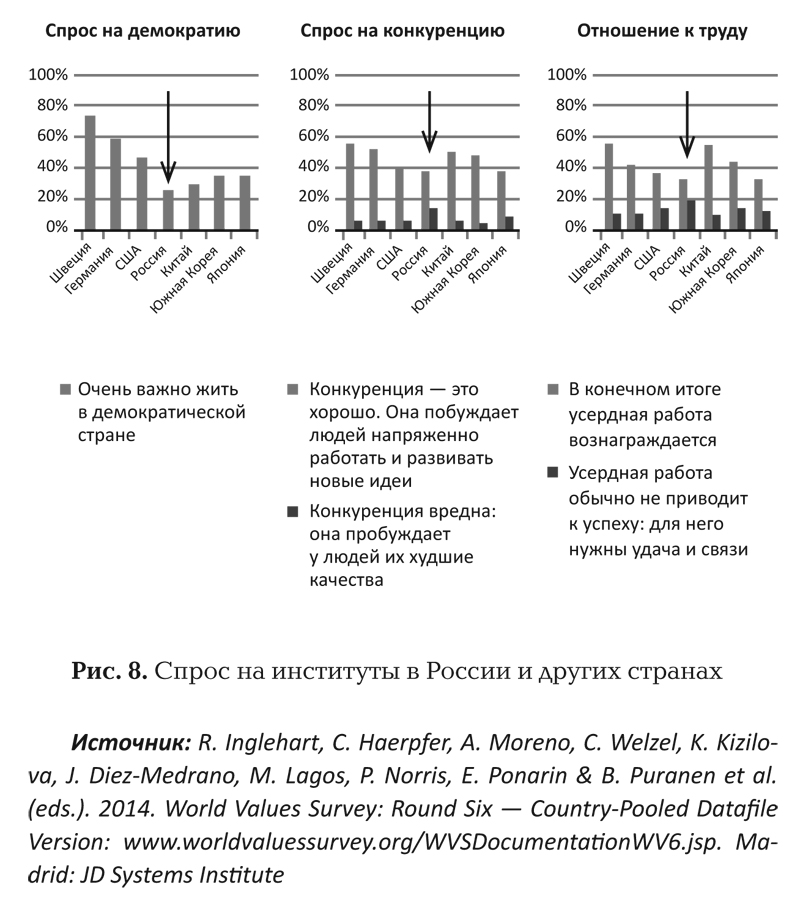 Поскольку это противоположные полюса, они дают очень странную среднюю температуру по больнице. Ну, например, по данным Всемирного исследования ценностей, спрос на демократию и конкуренцию в России принципиально ниже, чем не только, скажем, в Германии, Швеции и США, но даже в Японии, Южной Корее и Китайской Народной Республике. Как такое возможно? Тем более, что впервые эти данные появились после шестой волны Всемирного исследования ценностей в 2011 году, когда, напомню, в России вспыхнул бунт рассерженных горожан, и на площади вышли люди, требующие демократизации и модернизации.